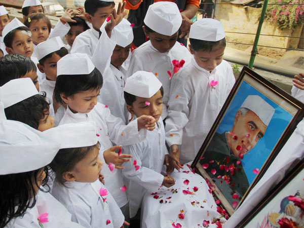 Children dressed up as Chacha Nehru pay floral tribute