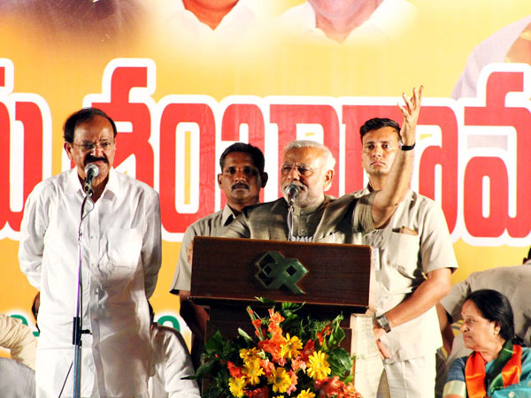 BJP Prime Ministerial candidate Narendra Modi addresses during BJP TDP election rally at Guntur in Andhra Pradesh on Thursday. BJP leader M. Venkaiah Naidu and TDP Chief N. Chandrababu Naidu are also seen.
