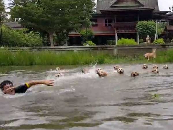 The above video shows a young man from Thailand jumping into a small local waterbody and as many as 16 Golden Retrievers doing the same after him. The pets do not even give it a second thought when they see their beloved owner taking the plunge, such is the trust they have on him. One of the dogs though did not jump initially but eventually it does. The pets are so mesmerised and does their swimming act in such a remarkable unison that it makes the entire video a drama overloaded with cuteness.