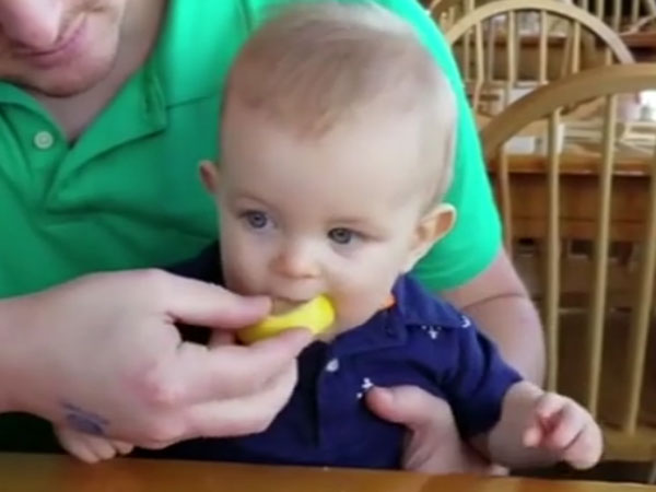 The cute baby boy goes on licking the sour fruit and every time, he comes up with a bizarre reaction which is equally cute, leaving his family members in splits.
