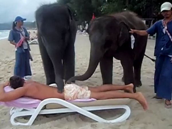 This is one of the funniest videos one has ever seen. Two baby elephants - Lucky (aged 3) and Lily (aged 4) - who were rescued from poachers and now live in an orphan shelter next in Phuket, Thailand, are taken for a walk every day along the beach. In this video, the two animals are seen giving a massage to a man who has gone to the beach for relaxation and lying down with only his shorts on.