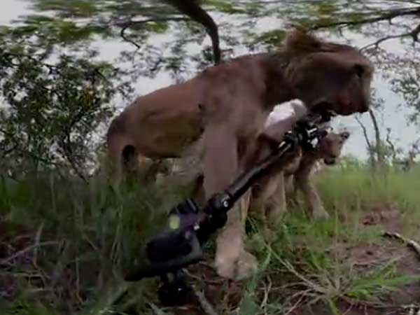A hungry lioness discovers an installed camera in the forest and attacks it thinking it to be food. We can see it biting at the device with its fearsome teeth and dragging it along in its mouth. Lions are lazy animals but are tenacious hunters when they decide to. The lioness here takes the camera to another place and after losing interest in it for sometime, it gets back to the camera, pulling, dragging and biting it.