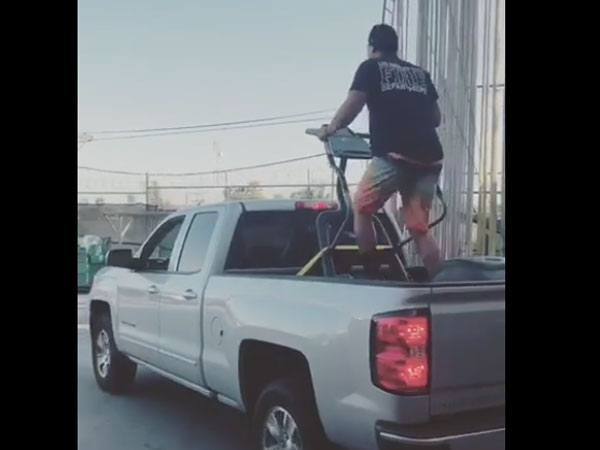 Here is a man, may be too much of a fitness freak, who starts running on a treadmill on the back of a silver truck. Perhaps he finds it suitable for him or may be he is into promoting a sporting equipment or wear which we don't know. But whatever it is, this man's strange act in public makes it look funny.
