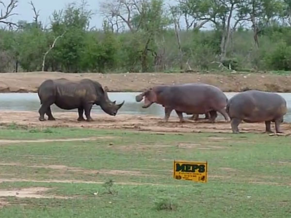 A rhino takes on a hippo family: Who wins the battle of the giants?