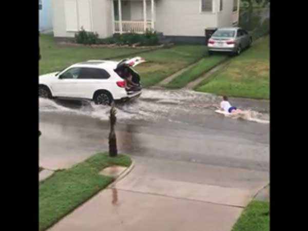 Here is a video which shows a woman deciding to spend the day in a unique way. She lies on a surfboard and connects it with a car and as it moves, she glides through the floodwaters, much to the glee of the neigbours.