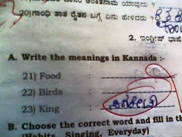 In a Kannada answer paper, for a question- what is the meaning of king in Kannada, a student wrote, the meaning of king is 'cigarette'. The student, however, it could be presumed that, got confused with the brand name ITC King to pen down the meaning as cigarette.