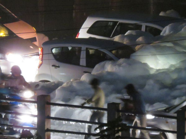 heavy rains that have been lashing the city for three days now have churned up the polluted lakes. Toxins are flowing into people's faces and collecting on the road forming a mountain of sorts. Cars were seen struggling to wade through the toxic foams.