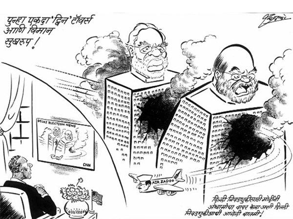 In a fresh cartoon sketched by him, MNS chief Raj Thackeray has shown BJP's top bosses i.e. Narendra Modi and Amit Shah as twin towers being attacked by AAP chief Arvind Kejriwal. The cartoon also shows US President Barack Obama watching BJP's drubbing on TV.