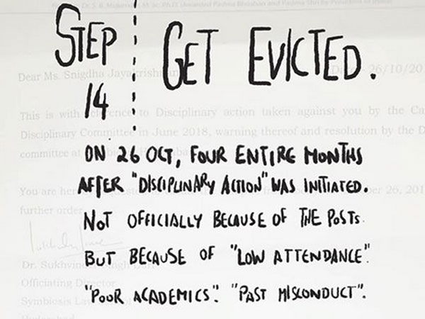 Sharath Ravishankar's illustration, named 'The Student's Guide To Reporting Sexual Harassment * And Paying The Price For It' helps in recalling the sequence of events that unfolded at the Hyderabad law college.