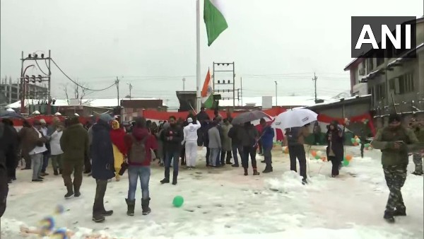 Donning a white T-shirt and a sleeveless jacket, the former Congress chief hoisted the flag at the camp site in Panthachowk to the tunes of the national anthem played to mark the culmination of the yatra, amid a fresh snowfall in the city.