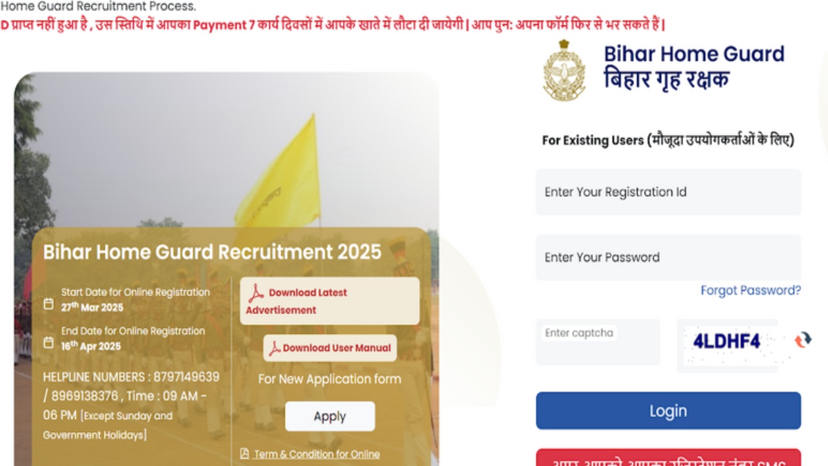 The Bihar Home Guard Corps and Fire Services will close the registration for Home Guard Recruitment 2025 on April 16, as per a Hindustan Times (HT) report. Candidates interested in applying for one of the 15,000 vacancies can visit the official website at onlinebhg.bihar.gov.in.