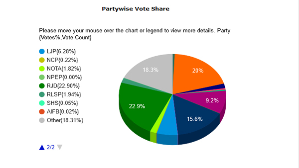 In the case of the BSP, it is 1.88 per cent and the LJP has 6.2 per cent. The RLSP has 1.92 per cent and those who opted for NOTA constitute 1.82 per cent the EC trends also show.