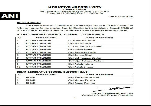 The Bharatiya Janata Party (BJP) on Sunday released list of candidates for upcoming Legislative Council (MLC) elections in Uttar Pradesh and Bihar.