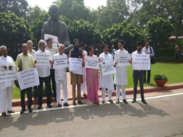 The protesting BJP leaders also raised the issue of "political killings" in Karnataka. The BJP leaders outside Parliament alleged that "political killings" are taking place in the southern state as a result of which many right-wing leaders have been murdered.