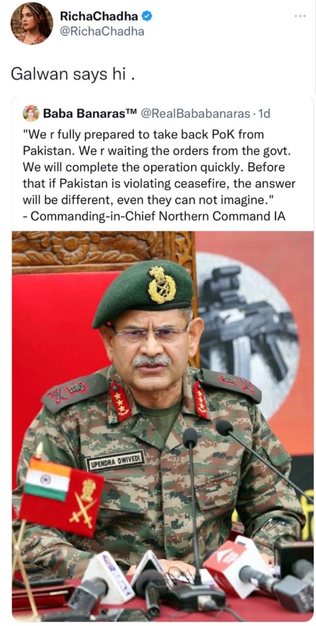 Richa tweeted in response, 'Galwan says hi.' In June 2020, Indian soldiers had a clash with the Chinese PLA soldiers. 20 Indian braves laid down their lives. The Chinese too lost many soldiers, but Beijing never gave out the official figures.