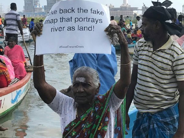Protestors allege that fraudulent CRZ maps have been drawn to deny the existence of Ennore creek. Fishermen are fighting to save the waterbody from none other than the Tamil Nadu government. Residents allege that the government through a fraudulent map has made way for Kamarajar Port, L&T Port, NTECL Vallur, HPCL and BPCL and parts of TANGEDCO's power infrastructure in brazen violation of CRZ status.