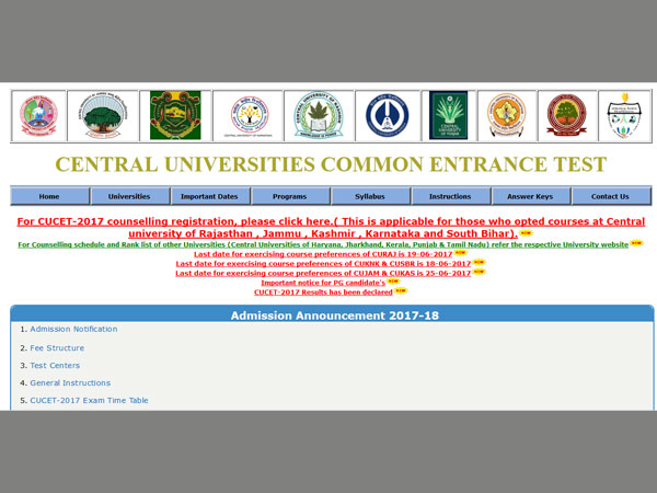 CUCET 2017 counselling registration has begun on the official website of the CUCET. The registration is for those who opted for courses in the Central university of Rajasthan , Jammu , Kashmir , Karnataka and South Bihar has started on the official website of CUCET.