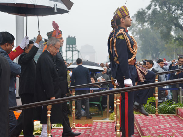 Minutes before the parade began, the Prime Minister, Defence Minister Manohar Parrikar and chiefs of army, navy and air force laid wreaths at 'Amar Jawan Jyoti', the war memorial at the India Gate where an eternal flame burns in memory of those who laid down their lives defending the frontiers of the nation.
