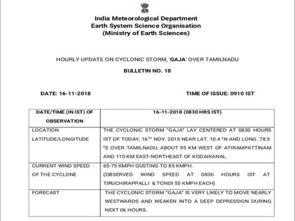 Severe Cyclonic Storm 'GAJA' weakened into Cyclonic storm about 95 km west of Athirampattinam and 110 km NE of Kodaikanal with wind speed of 65-75 kmph gusting to 85 kmph.