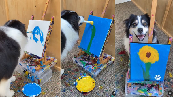 The dog after coming in front of the camera with a blue acrylic paint tube goes ahead and paints with a paintbrush. She then returns with a light green colour tube and then paints the step of the flower. To watch how Secret paints, check out the video below. Also do let us know what you think of this dog's painting skills in the comments section below.
