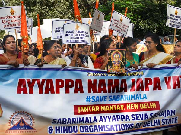 Hundreds of devotees, mostly women, took part in the 'Ayyappa Nama Japa Yatra' (chanting the name of Lord Ayyappa marches) across the nation against the Pinrayi Vijayan-led LDF government's decision to implement the Supreme Court's verdict on the entry of women of all ages into the Sabarimala Lord Ayyappa Temple. While Lord Ayyappa's devotees held protests in Bengaluru and New Delhi's at Jantar Mantar on Sunday, several others protested in Kottayam and Malappuram districts of Kerala on Saturday against the apex court verdict.