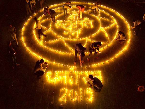Earthen Lamps lit in an artistic style on the occasion of Dhanteras in Moradabad