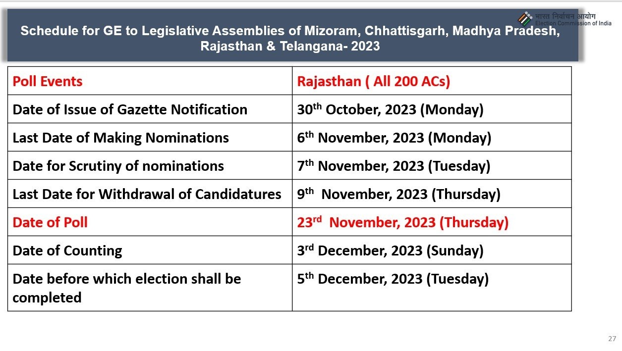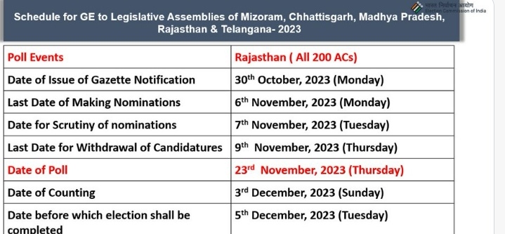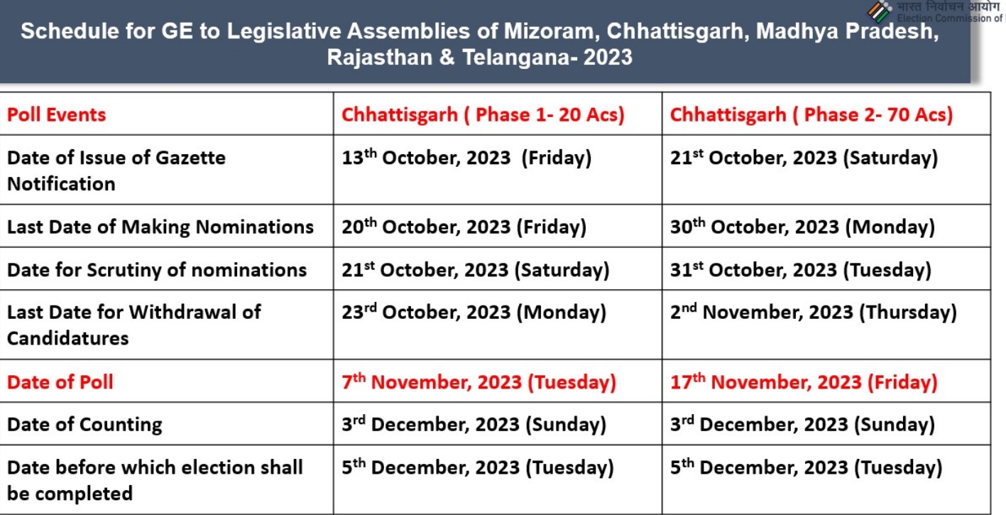 The elections will be held in Mizoram on November 7, Chhattisgarh on November 7 and November 17, Madhya Pradesh on November 17, Rajasthan on November 23 and Telangana on November 30.