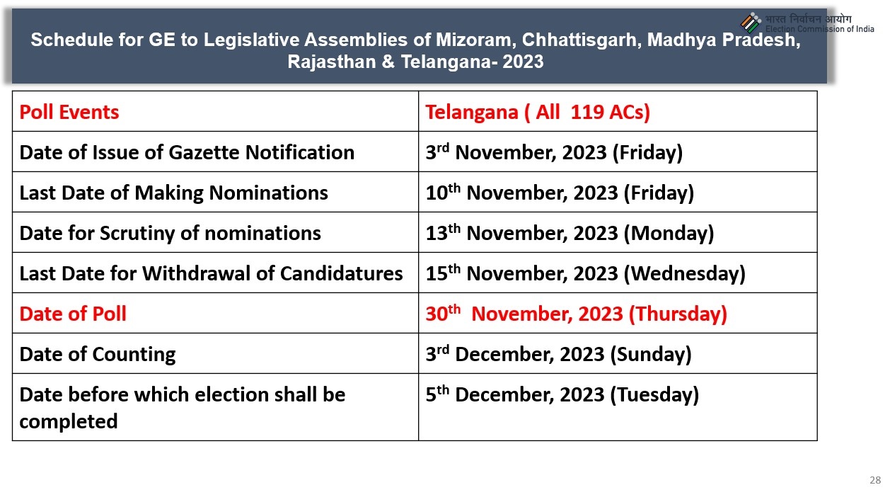The Election Commission on Monday announced the schedule for assembly polls in Mizoram, Chhattisgarh, Madhya Pradesh, Rajasthan and Telangana.