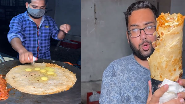 The roll costs Rs 600, while the vegetarian version of it is Rs 400. In the video the vendor is seen taking six doughs and rolling them into one paratha. He then puts the same on the tawa and breaks a total of 10 eggs and cooks it.