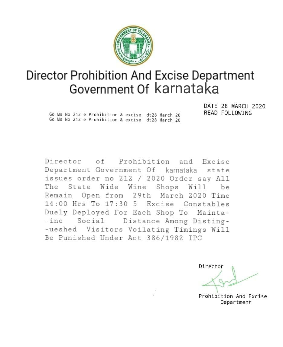 The circular states, " director of prohibition and excise, department Government of Karnataka states issues order no 212/2020. Order says all the wine shops in the state will remain open from March 29 between 14:00 hours to 17:30. 5 excise constables would be duly deployed at each shop to maintain social distancing. Those violating the timings would be punished." The circular is signed by the Director, Prohibition and Excise Department.