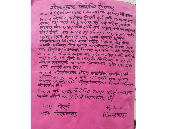 A handwritten poster appeared at the Bakery-golai in Mirik Bazar in the wee hours of the Thursday. Written in black on pink poster paper the poster claimed that the GLA can go to any length for Gorkhas and Gorkhaland.