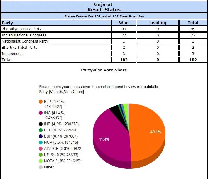 In percentage terms, 1.8% voters in Gujarat pressed the NOTA button higher than that of any party other than that of the major political parties. While the saffron party secured 49 per cent votes, Congress received 41.4 per cent and independents together polled for 4.3 per cent.