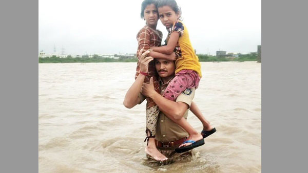 Gujarat cop carries two girls on his shoulder as he wades through gushing waters