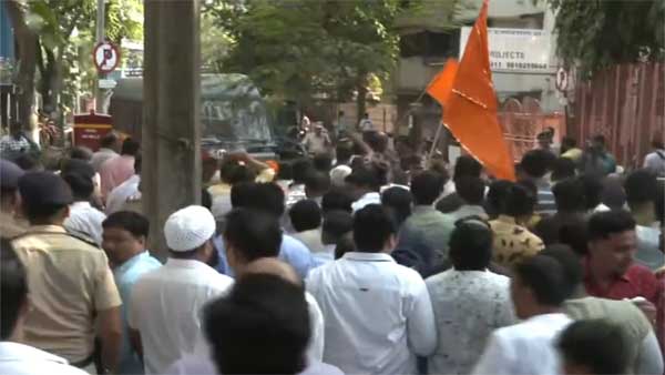 Mumbai, Apr 22: The workers of Shiv Sena workers on Friday protested outside the residence of Amravati MP Navneet Rana in Mumbai as the MP plans to chant Hanuman Chalisa along with her husband MLA Ravi Rana outside 'Matoshree', the residence of Maharashtra Chief Minister Uddhav Thackeray.