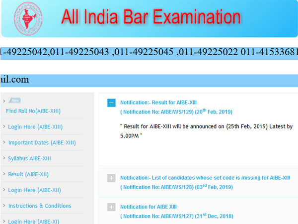 A notification on the official website said that the " Result for AIBE-XIII will be announced on (25th Feb, 2019) Latest by 5.00PM "