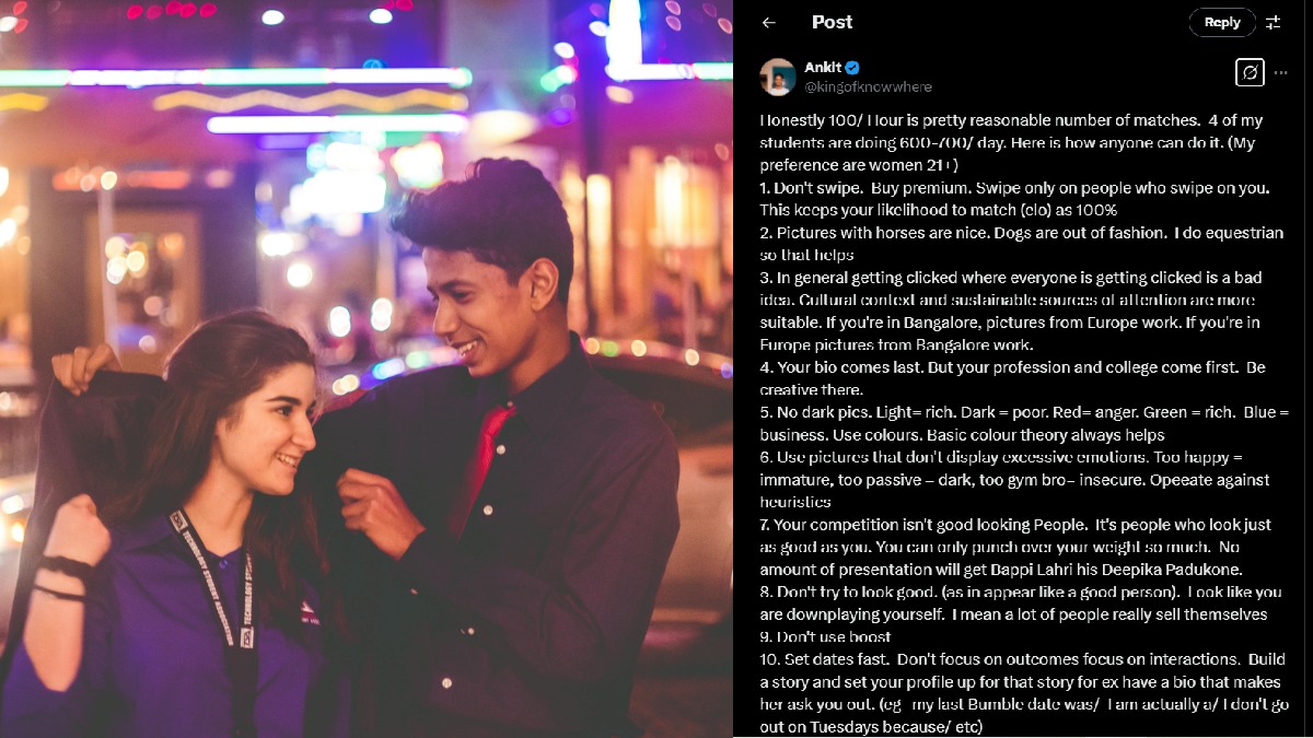 In a follow-up post, Ankit shared his strategy for increasing matches on dating apps. He recommended a data-driven approach, using premium features to swipe only on profiles that had already liked him. He highlighted the importance of profile pictures, stating that images featuring horses, European travel, and bright lighting create an impression of sophistication and wealth.