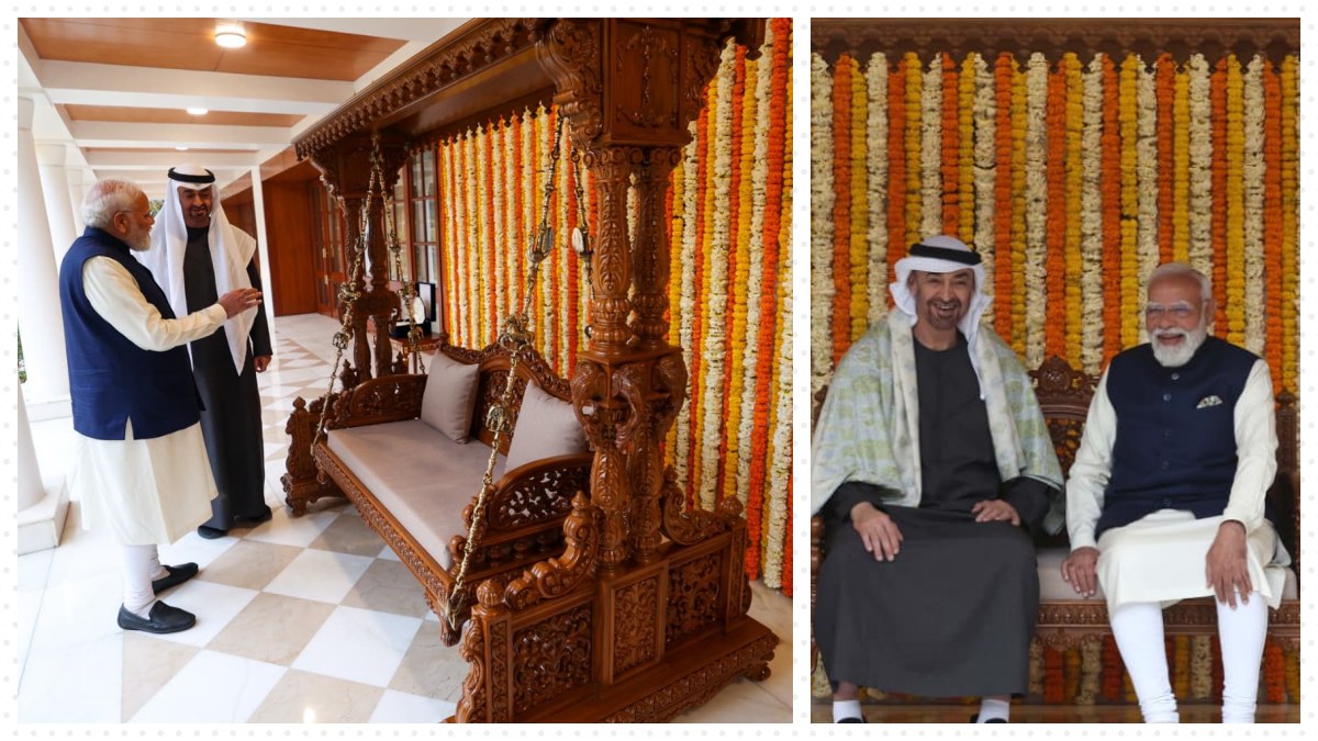Prime Minister Narendra Modi presented a hand-carved wooden jhula (swing) and a pashmina shawl to UAE President Sheikh Mohamed bin Zayed Al Nahyan during the latter's brief two-hour visit to India, drawing attention to India's tradition of cultural diplomacy.