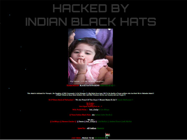 Bengaluru, Jan 7: A group of Kerala based hackers defaced seven Pakistani websites including that of Pakistani Bar Council on Wednesday, Jan 6. The group of hackers, who are popularly known as 'Indian Black Hats' have said that the only reason for hacking is to dedicate this hacking to 18-month old daughter of martyr Lt. Col Niranjan of National Security Guards (NSG).