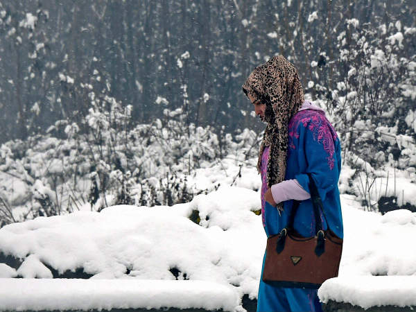 A woman walks during snowfall in Srinagar. The temperature on Tuesday dropped to minus two degrees and the region is expected to receive more snow.