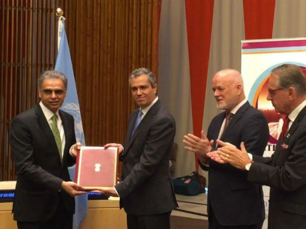 Permanent Representative to the U.N. Ambassador Syed Akbaruddin handed over the Instrument of Ratification signed by President Pranab Mukherjee, to Santiago Villalpando, the Head of the Treaties Division at the U.N., at a special ceremony here attended by top U.N. officials and senior diplomats to commemorate Mahatma Gandhi's birth anniversary.