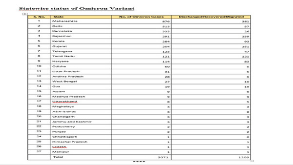 New Delhi, Jan 08: A total of 3,071 cases of Omicron variant reported across 27 states and union territories so far, the Union Health Ministry said on Saturday.