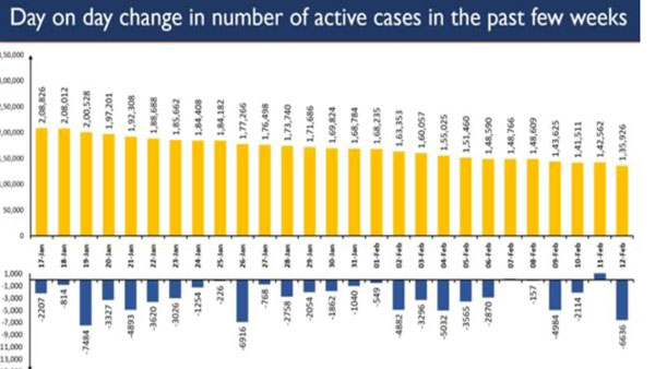 New Delhi, Feb 12: The country's total Active Caseload has seen a sharp decline, falling to 1.35 lakh (1,35,926) today.