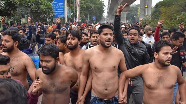 New Delhi, Dec 16: A group of Jamia Millia students stood shirtless in the bone-chilling cold outside the university gates on Monday to protest the police action against their colleagues a day earlier.