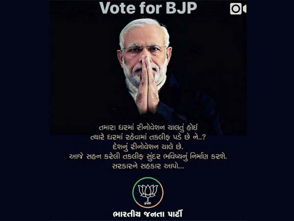 "When our homes are renovated don't we face inconvenience? Now, the entire nation is being renovated, so please bear with this and support BJP," reads the new poster of Modi, done by the BJP especially for the Gujarat polls.