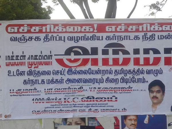 Bangalore, Oct 7: In a shocking development in Jayalalithaa case, posters have emerged saying that Tamil Nadu will make Kannadigas hostage if Jayalalalithaa is not released. The threatening poster asserted that Kannadigas living in Tamil Nadu will be arrested and be sent to jail if AIADMK chief is not released from Bangalore jail.