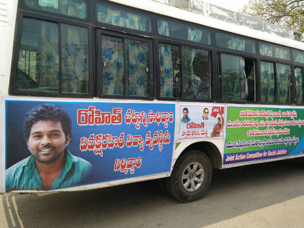 Both the bus yatras have been organized by the Joint Action Committee (JAC) for Social Justice, University of Hyderabad (UoH). The members of the JAC have been at the forefront demanding justice for Rohith. The 26-year-old Dalit research scholar was found hanged in the university campus on January 17.