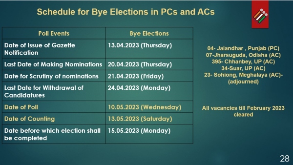 Date for nominations: April 13, Last date for filing nominations: April 20, Date for scrutiny of nominations: April 21, Last date for withdrawal of candidatures: April 24, Date of poll: May 10 and Single Phase Date of counting on May 13.