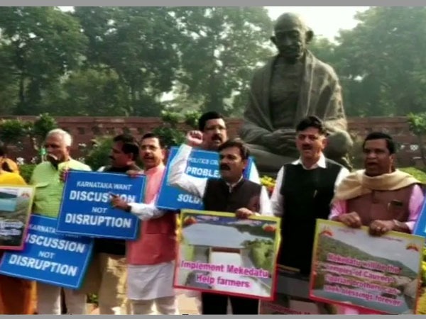 Outside, MPs from Karnataka shouted slogans like "We want Mekedattu project" and held up placards that read "Karnataka wants discussion not disruption", "Politics create problem, Mekedattu gives solution" and "We want Government of India to respect Supreme Court verdict".
