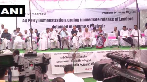 New Delhi, Aug 22: Opposition parties led by the Dravida Munnetra Kazhagam protested on Thursday demanding the immediate release of those detained in Jammu and Kashmir after the state's special status was scrapped.