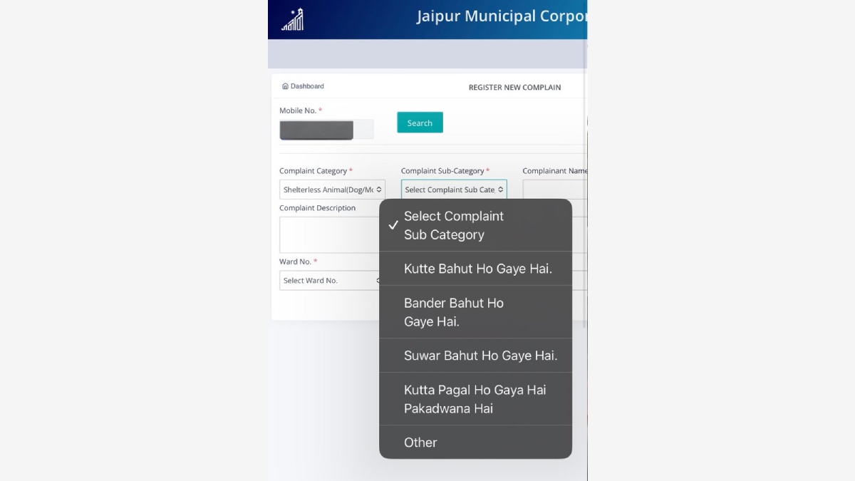 Residents of Jaipur can easily register their concerns, whether they are worried about the increasing stray dog population ("Kutte Bahut Ho Gaye Hai") or the illegal renting of residential properties for commercial purposes ("Marriage Hall Chal Raha Hai").